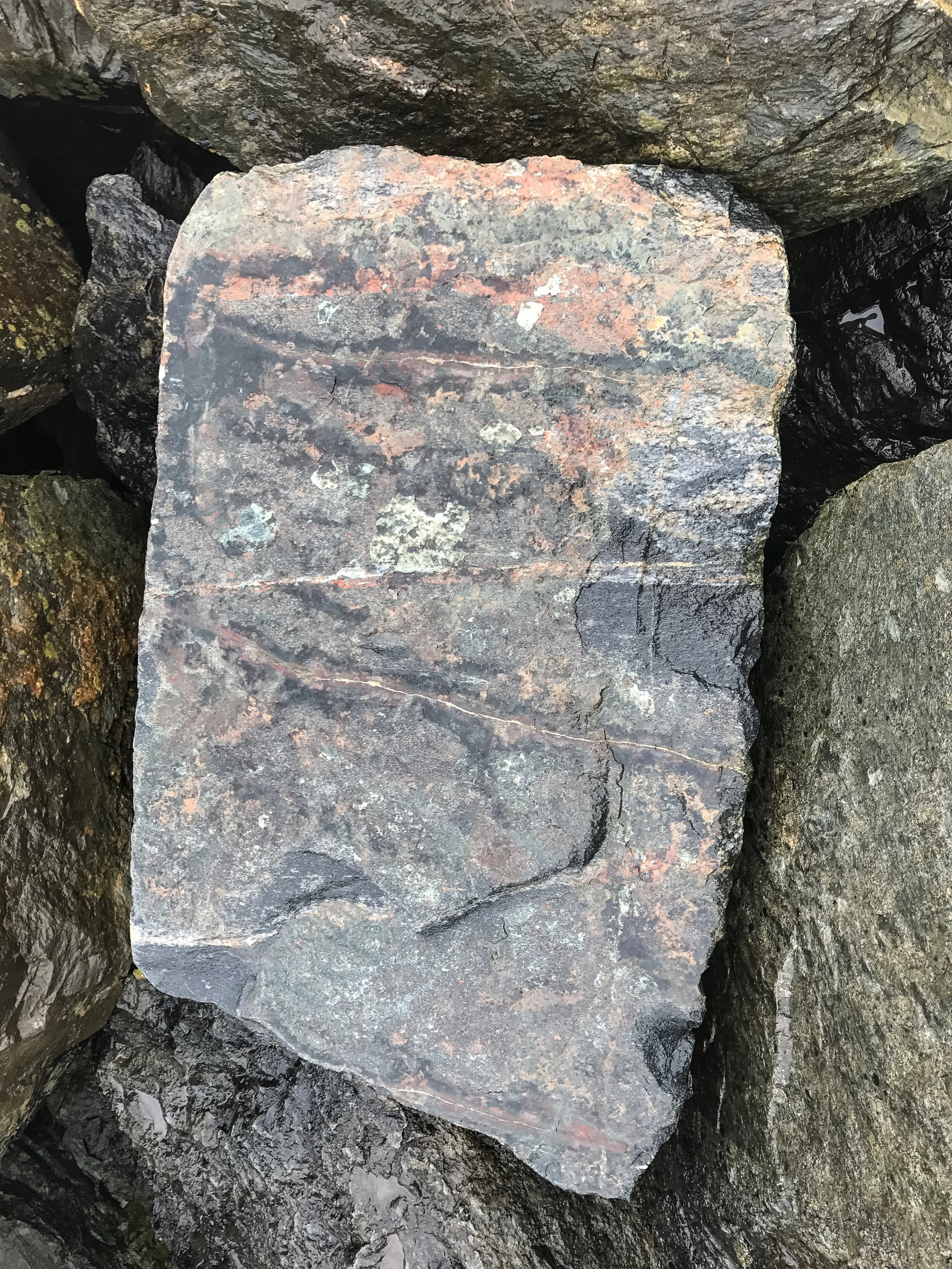 A piece of pink and green granitoid stone that helps form a jetty in Le Verdon-sur-Mer.