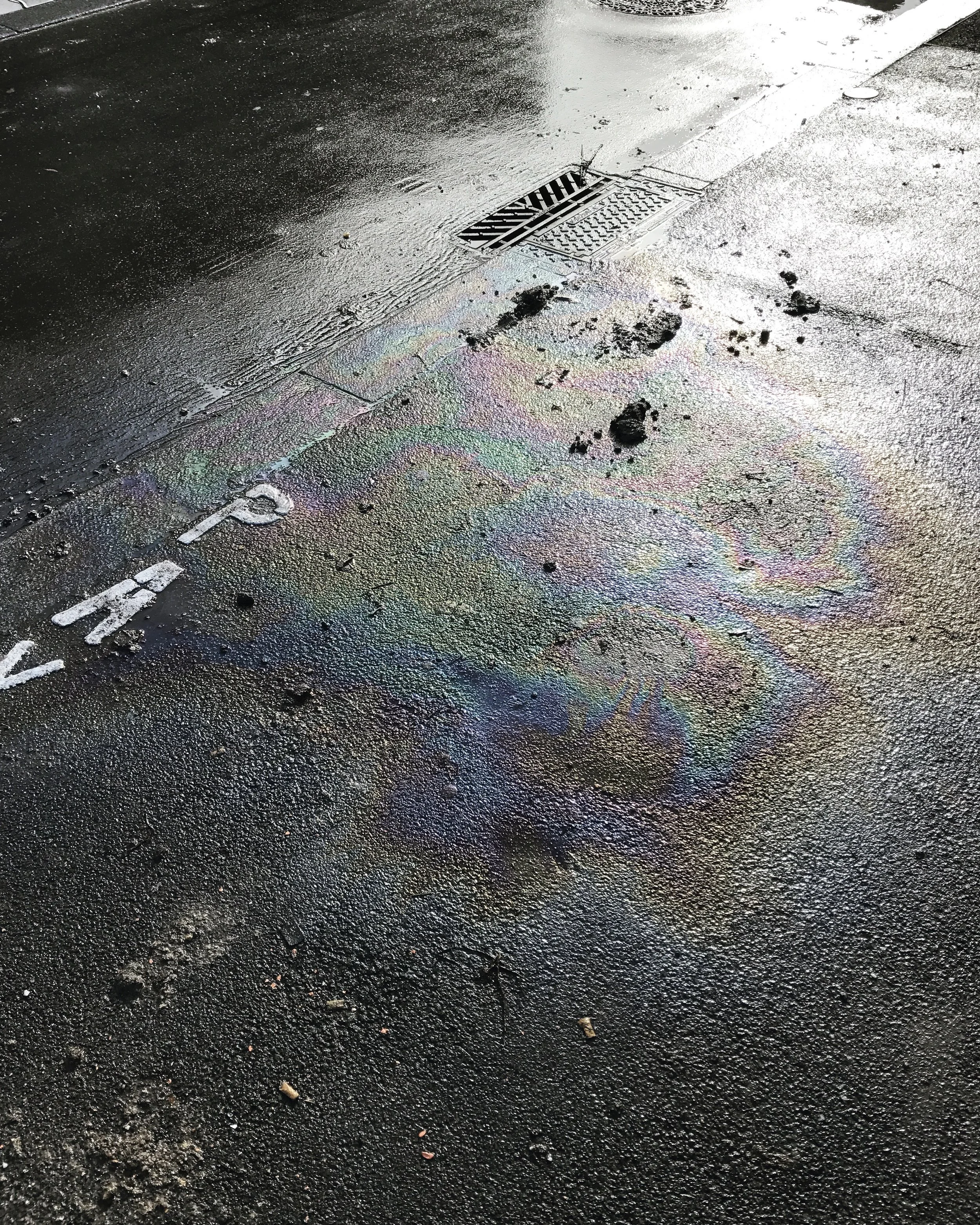 An oil slick on the street outside Gare de Bordeaux Saint-Jean.