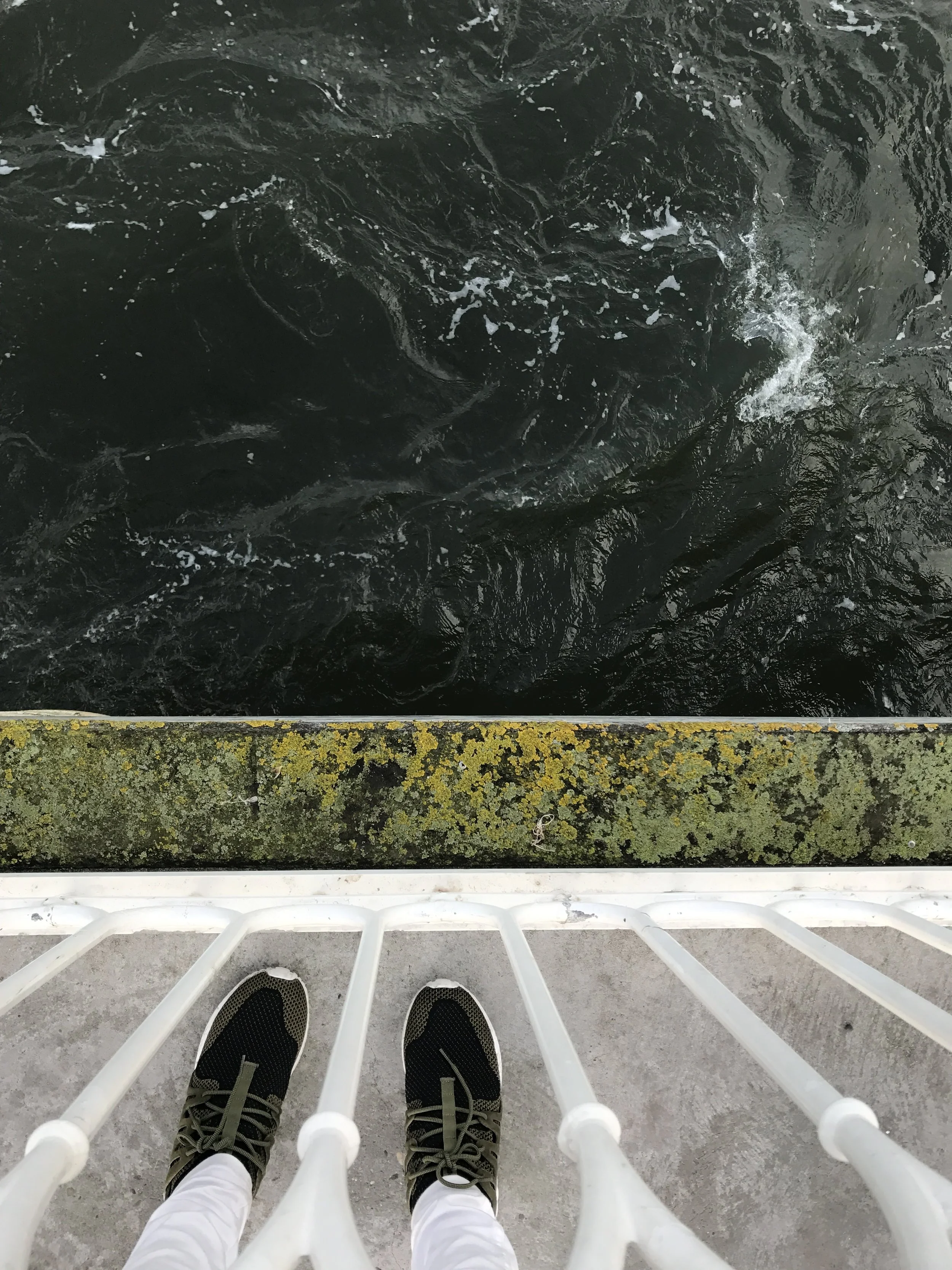 The day the ocean and I wore the same thing. A pier at Arcachon, cast concrete, painted wrought-iron, cement covered in lichens, and the ocean.