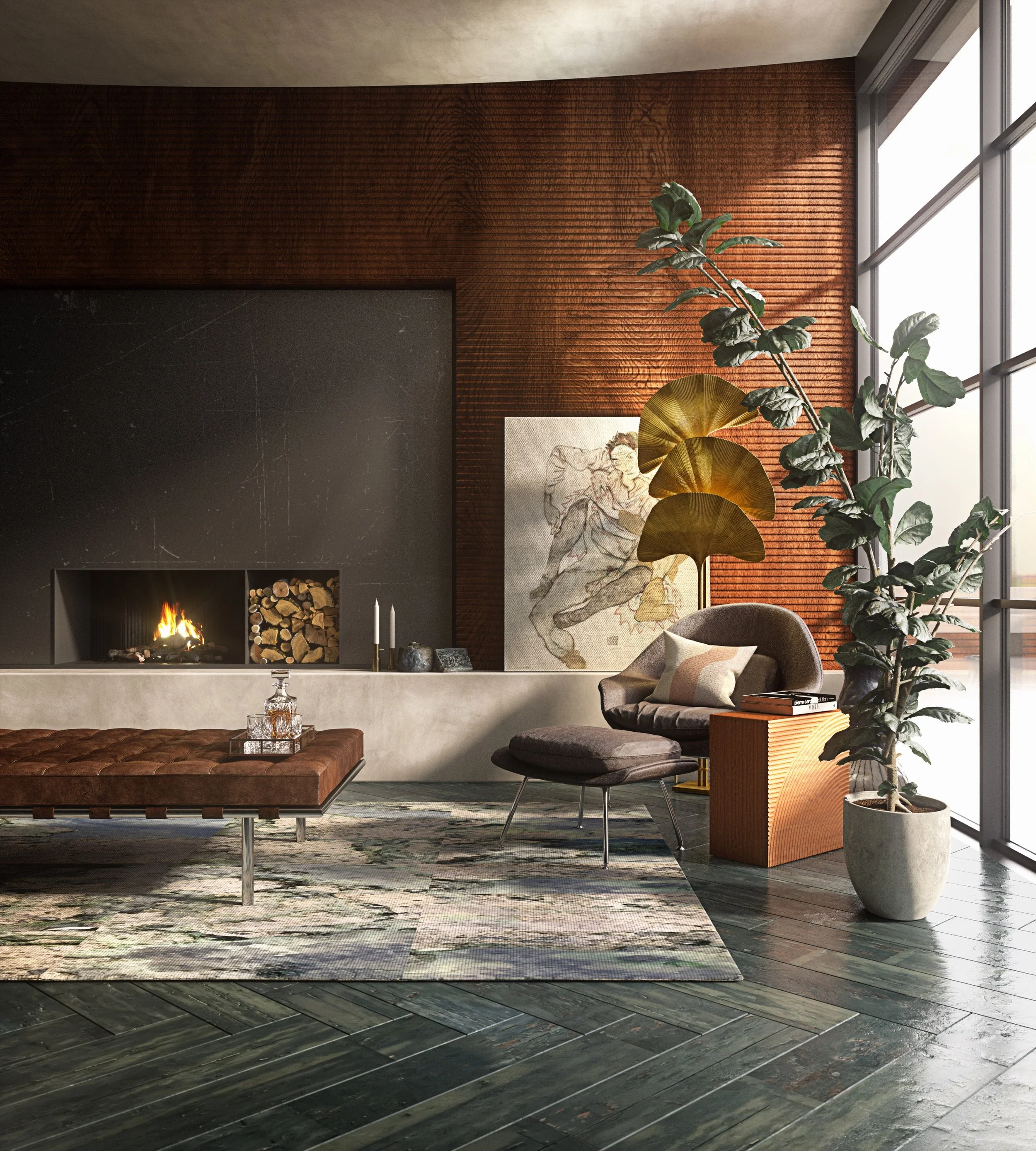 A flooring concept using a wooden door from the Chartron neighborhood of Bordeaux as inspiration for the LVT. The rug is designed after the tidal pools of Saint Palais. This space also uses our routed walnut panels and features a Ray Table. Image by Nathan Dreimiller.
