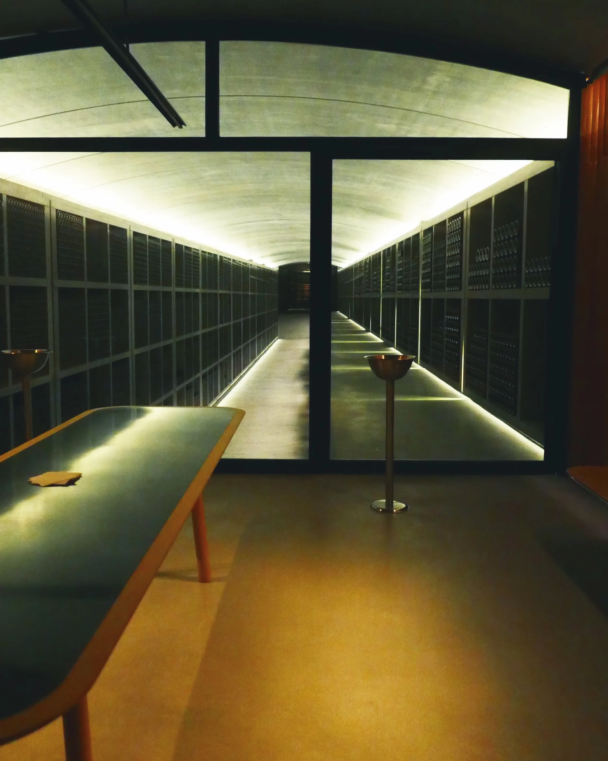 After walking around this gorgeous building, my guide led me down a spiral staircase and into the private wine cellar of the Chateau’s inhabitants. Also designed by Foster, this space was designed with a lot more leeway. Since it was buried underground, it needed less consideration to the existing architectural styles. It kind of felt like if Apple sold wine. The room was 30’ high, 30’ wide, and a couple hundred feet long. There were over 30,000 bottles of wine in that room, and it’s here that I got to taste the Pavillon Rouge that I had been promised on the phone.